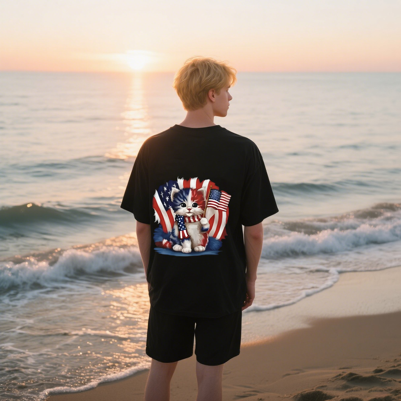 Cat With American Flag T-Shirt, For 4th of July, Cotton, Short Sleeve, Crew Neck, Unisex For Men And Women