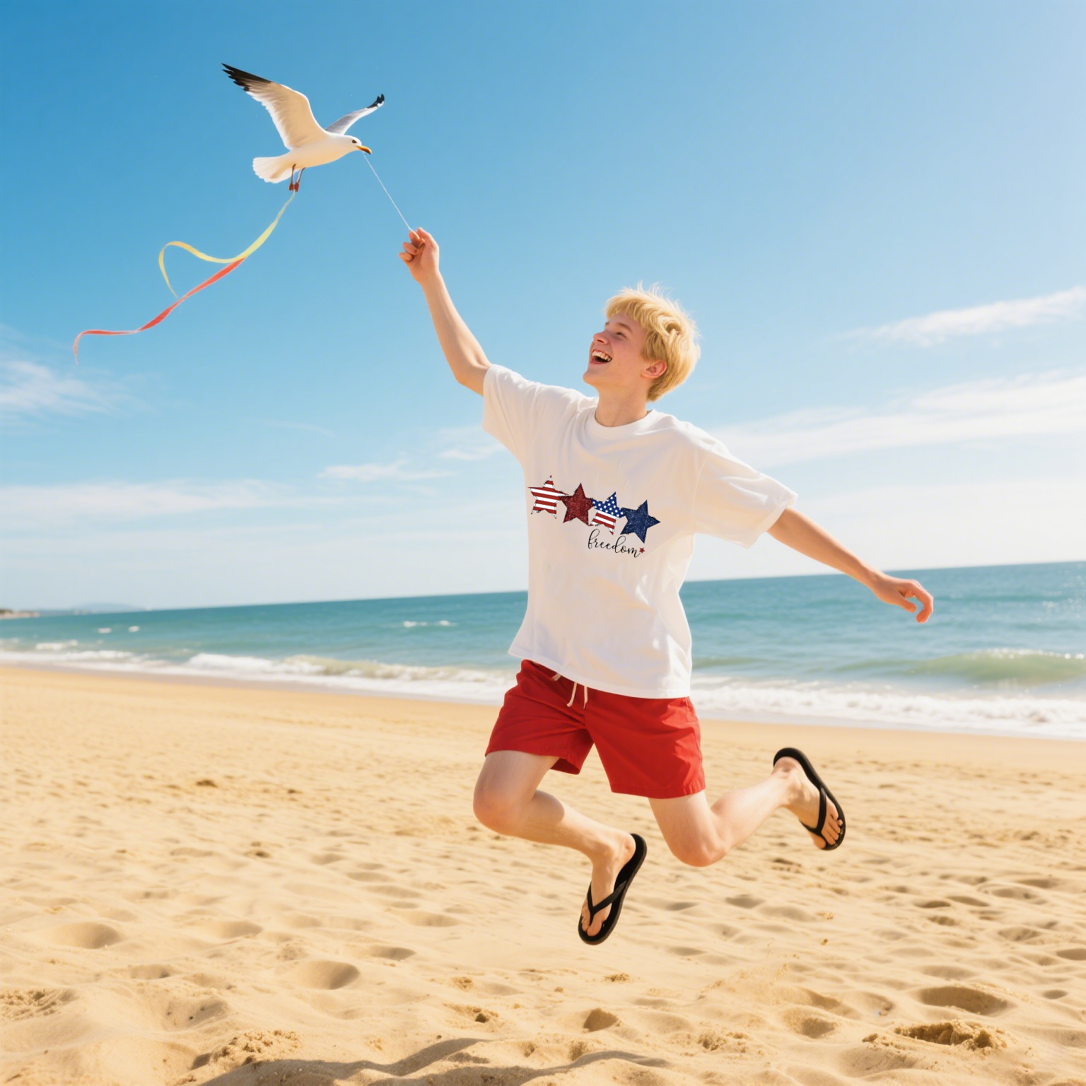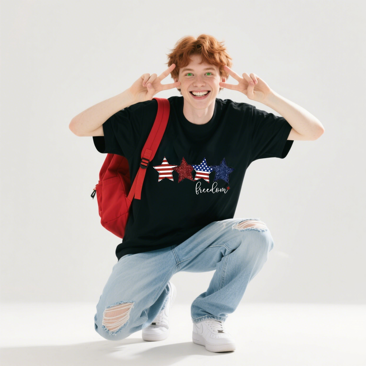 Freedom And Four Stars With American Flag Colors T-Shirt, For 4th of July, Cotton, Short Sleeve, Crew Neck, Unisex For Men And Women