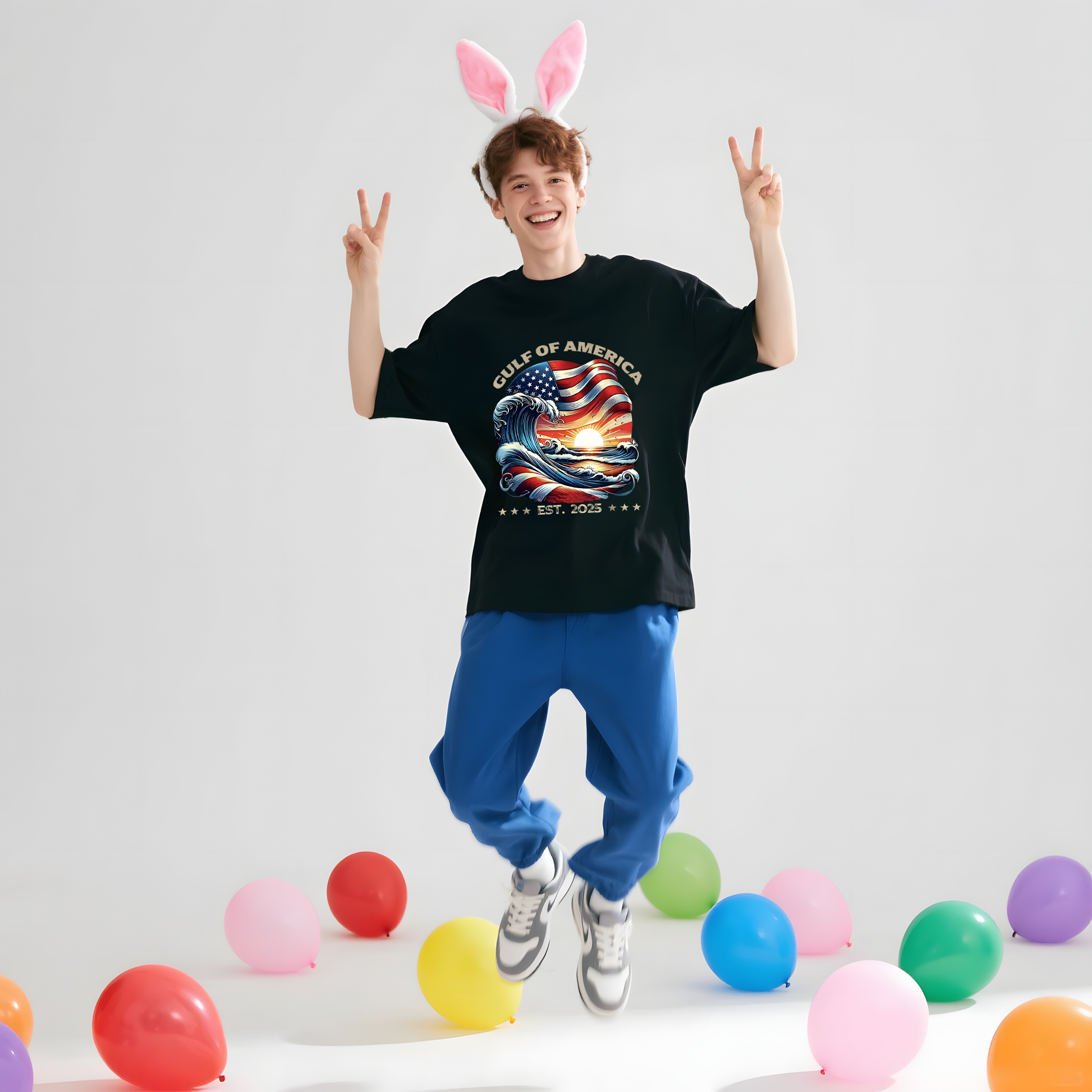 Gulf Of America Est.2025, Waves And Sun With America Flag T-Shirt, 100% Cotton, Short Sleeve, Crew Neck, Unisex For Men And Women